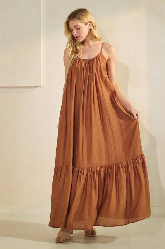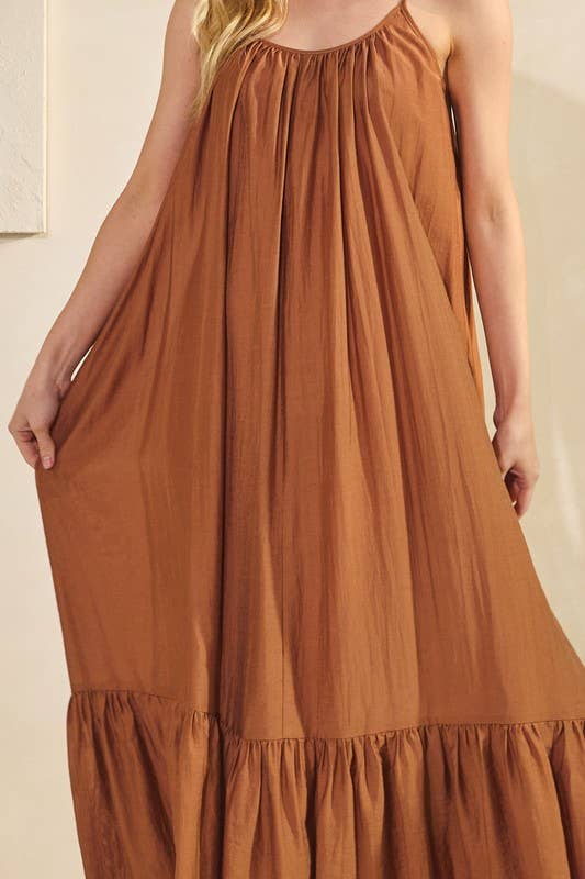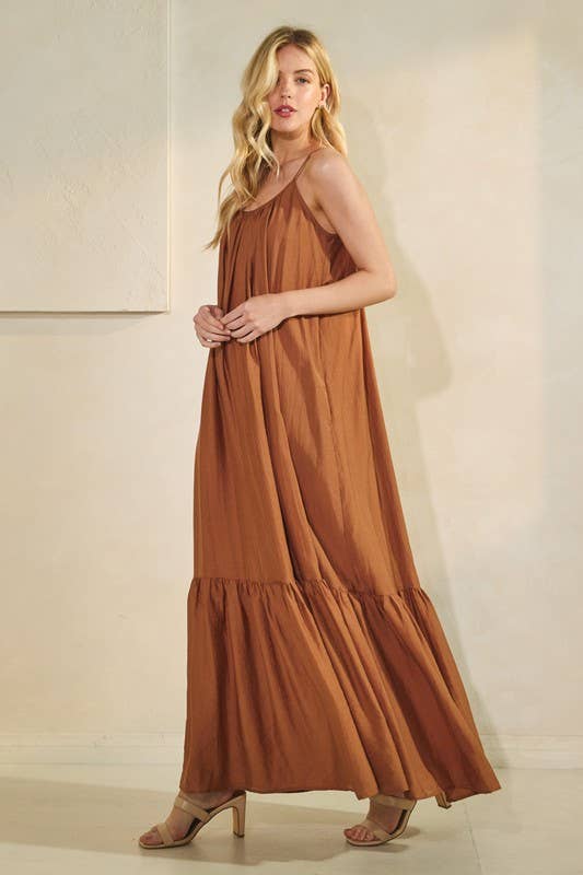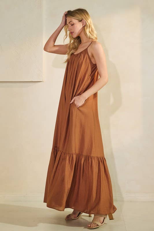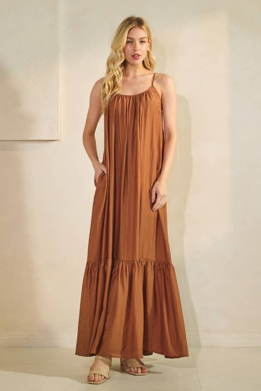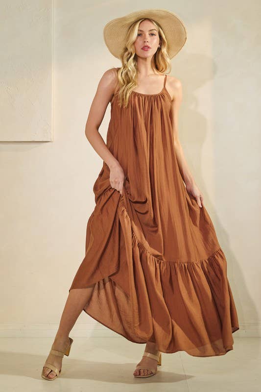 Step into sunshine with the Sweet Like Cinnamon Maxi Dress! This flowy, sleeveless beauty features adjustable straps and a low back for a perfect fit and breezy comfort. Its pleated detailing adds a touch of elegance, while the warm cinnamon brown hue keeps you effortlessly stylish. Ideal for beach days or everyday adventures, this dress pairs perfectly with heels and gold jewelry to turn heads wherever you go. Upgrade your spring and summer wardrobe with this playful, draped maxi that’s as fun as it is fashionable.