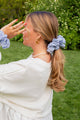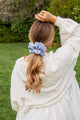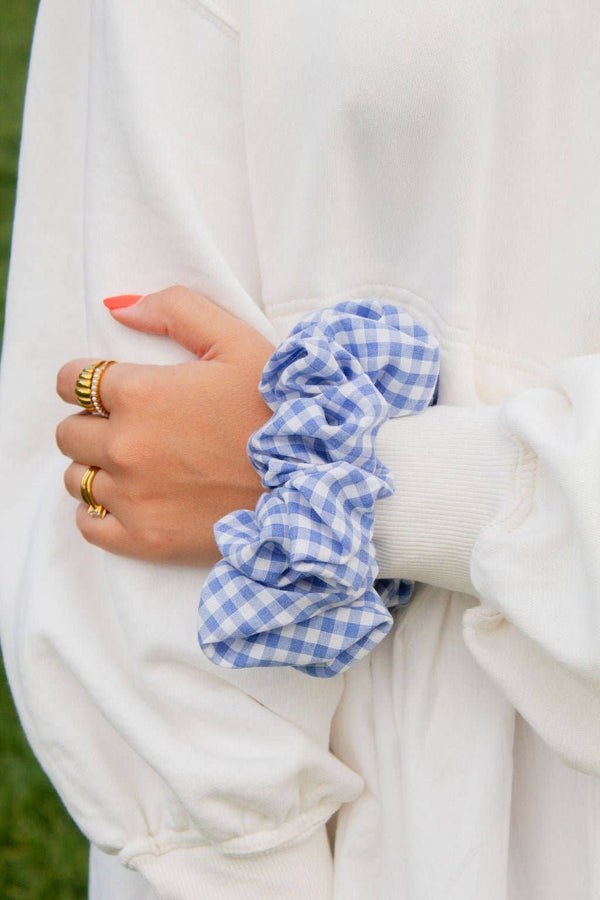 This jumbo scrunchie will be the best addition to your closet this summer! Made with a cotton fabric, and featuring a blue and white gingham pattern, it has the softest feel and is gentle on your hair. It’s perfect for any hairstyle your heart desires and will add a beautiful and dreamy touch to every outfit, for any occasion.