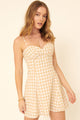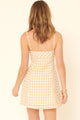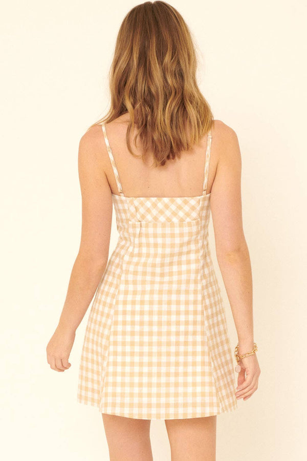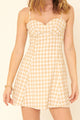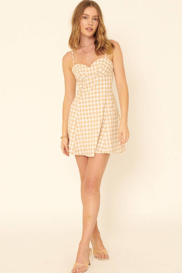 This playful mini dress features a sand and cream plaid print with a flattering sweetheart neckline supported by boning for a perfect shape. Sleeveless with adjustable cami straps, it offers a fitted silhouette that flares into a fun skirt. The invisible zipper and hidden elastic at the back ensure a comfortable, flattering fit. Perfect for adding a charming touch to any occasion.