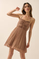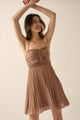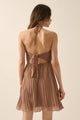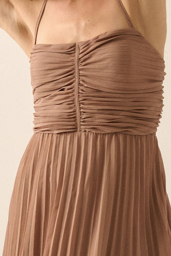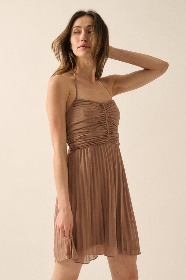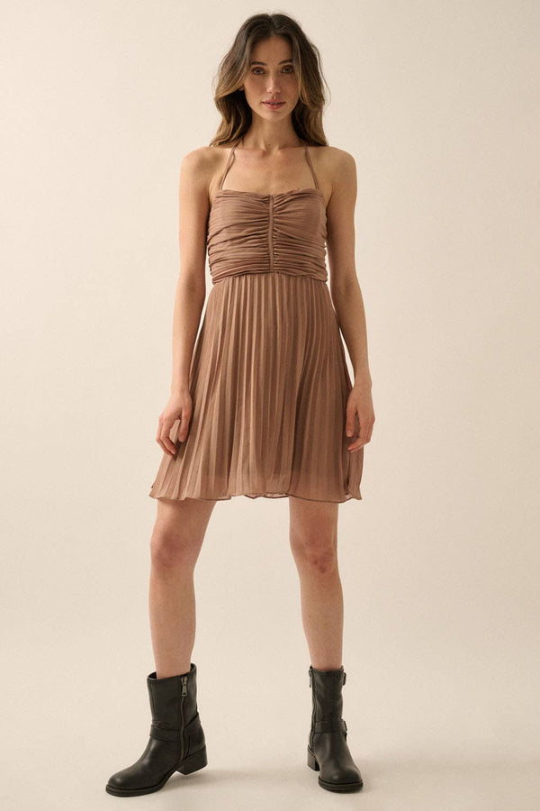 The Gathered Together Dress in mocha is a playful and elegant choice for special occasions. This sleeveless mini dress features a halter neckline, ruched bodice, and a pleated skirt that adds movement and charm. The open back with self-tie straps and elastic back waist create a relaxed yet flattering fit. Lined for comfort and thigh-length for a flirty vibe, it’s perfect for weddings, parties, or showers where you want to stand out with beautiful details.