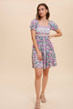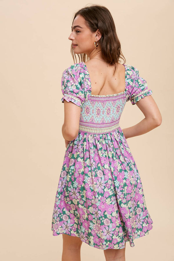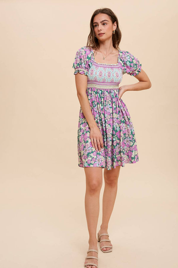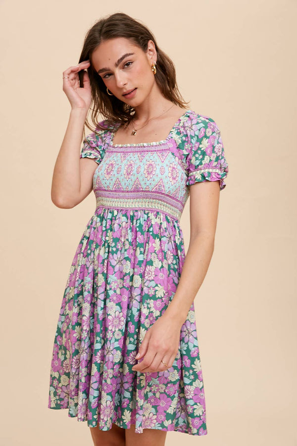 Experience free-spirited elegance in our Bohemian Bliss Dress! With a square neck and smocked bodice, this mini dress is perfect for any bohemian goddess. Featuring a floral print and contrast border, it's the ultimate blend of girly and bohemian. Don't miss out on this must-have piece!
