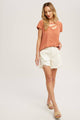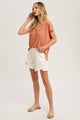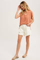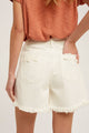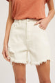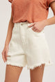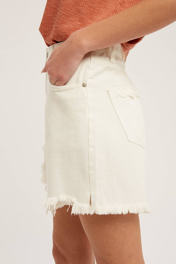 A fresh pair of denim shorts in creamy white. Crafted from a sturdy non-stretch cotton material, these shorts offer a zip fly with button closure, a frayed raw cut hem, a high-rise waist, destroyed accents, a washed effect, and a traditional five-pocket design. With a relaxed, flattering mid length and a loose fit around the thighs, these shorts are both comfortable and stylish. -Model is 5'9" and wearing a Small