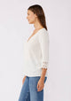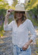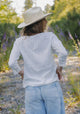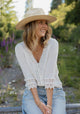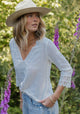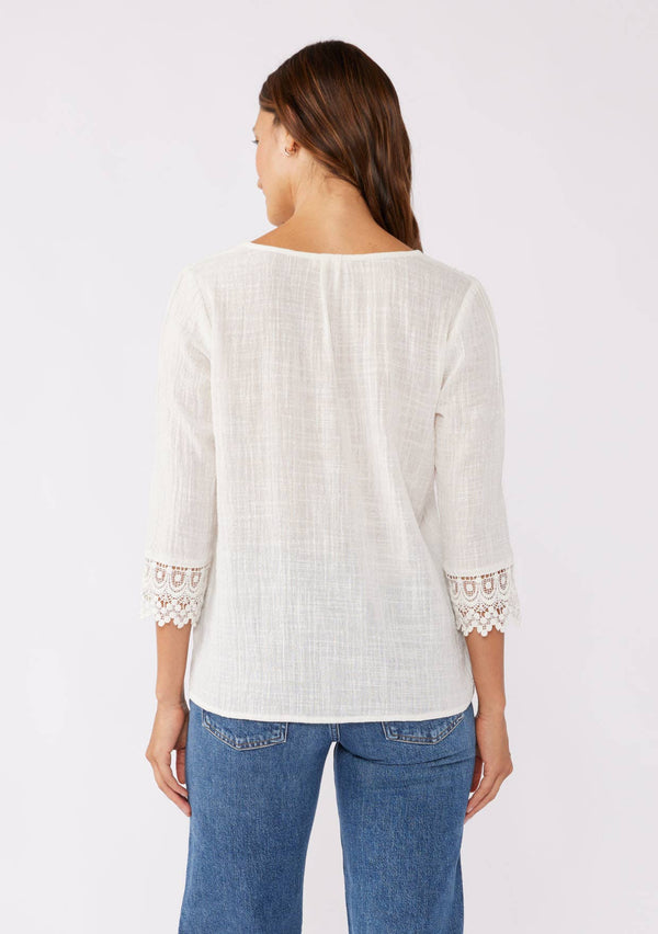 Let your free spirit shine in our 100% cotton Free Spirit Blouse. With delicate lace trims, geometric lace cuffs, and charming pintucks, this V-neck button-down is the perfect mix of playful and elegant. Embrace your unique style and comfort in this airy summer top.