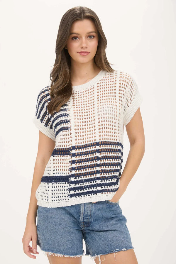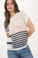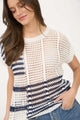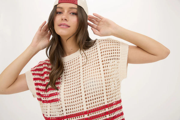 Celebrate summer in style with this playful Americana Stripe Sweater Top. Featuring a sheer crochet knit with bold colorblock stripes in cream/red or white/blue, its round crew neck and extended shoulders add a trendy touch. The short sleeves and lightweight, unlined design keep you cool for 4th of July festivities or sunny days. Pair it with white trousers for a chic vibe or denim shorts for a laid-back summer look.