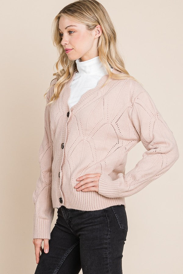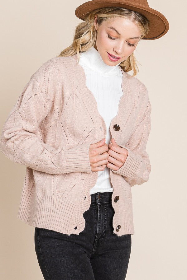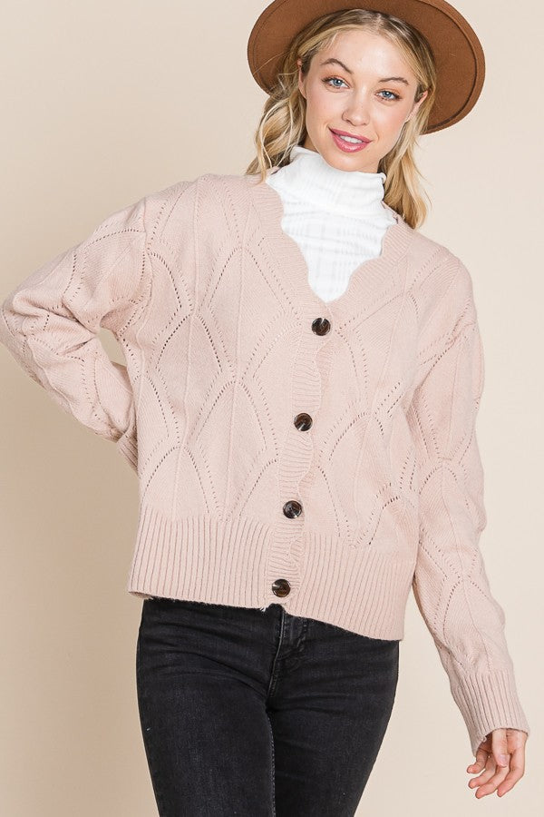 The Berwyn Scallop Edge Cardi is your new favorite layering piece with a playful twist. Featuring a delicate pointelle knit, scalloped edges trace the V-neckline and front for a flirty, feminine touch. Soft ribbed cuffs and hemline keep things cozy, all wrapped in a charming rose taupe hue. Button it up for warmth or wear open for easy style—perfect for adding a little fun to your everyday wardrobe.