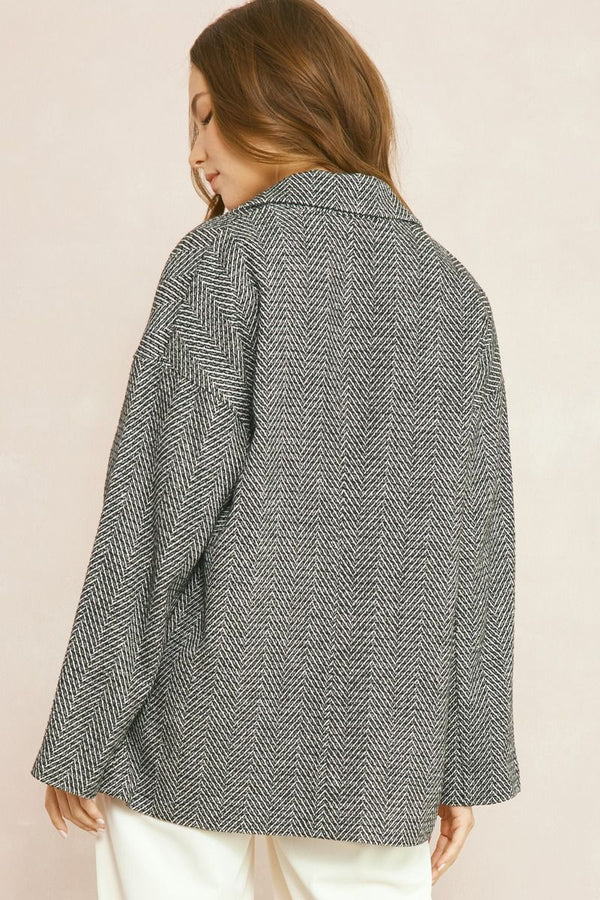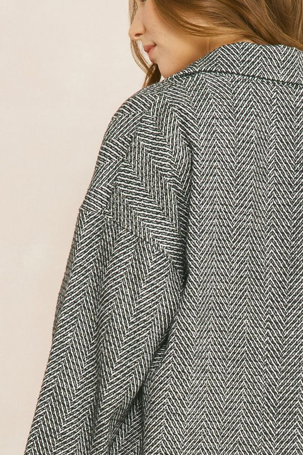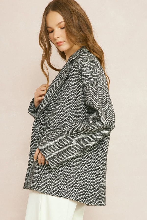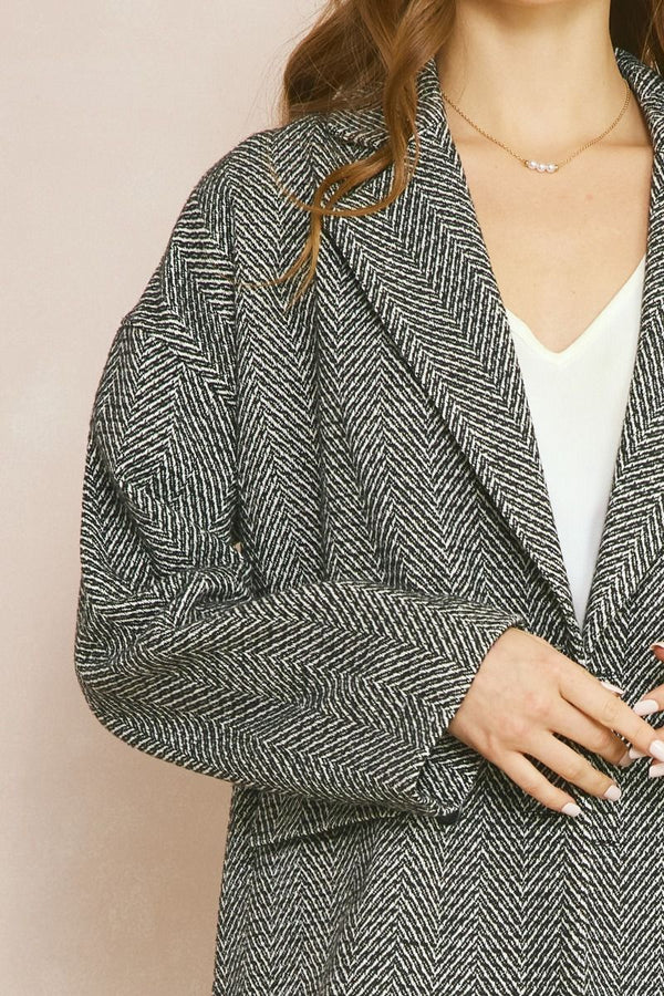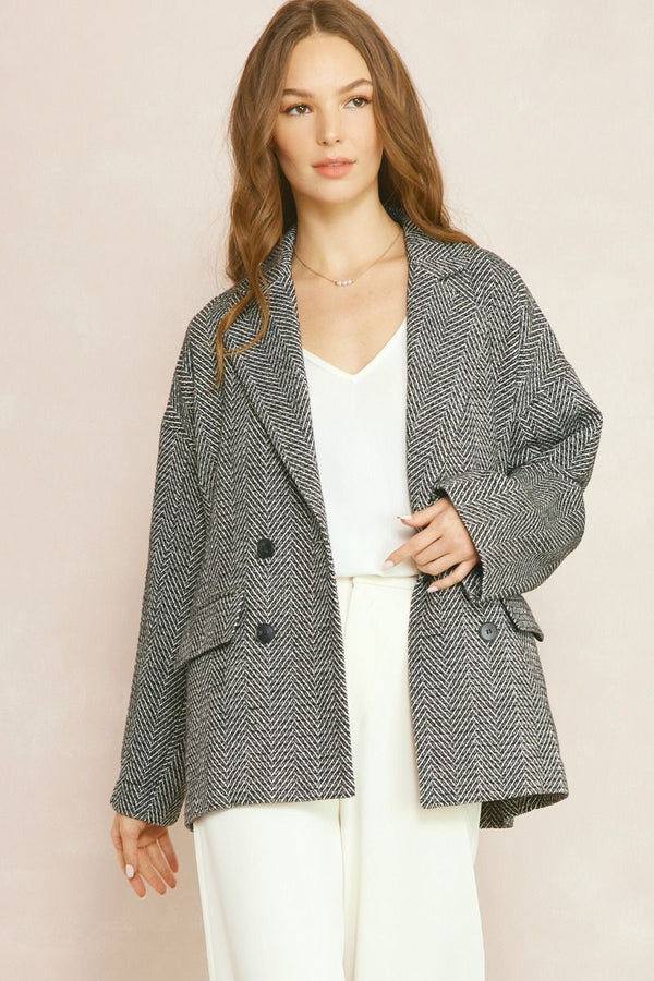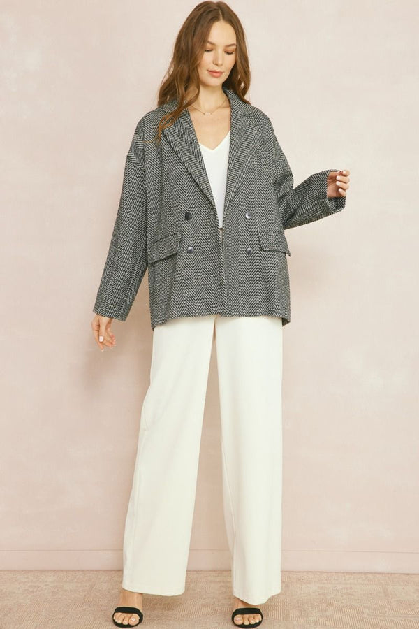Elevate your style with our Boardroom Herringbone Blazer. Its herringbone knit, double breasted design exudes sophistication, while the boxy, oversized fit adds a touch of effortless chic. Featuring front patch pockets and a medium weight, unlined construction, this blazer is suitable for the office or a day out.