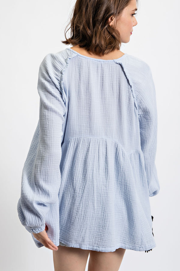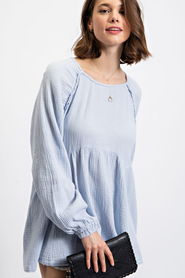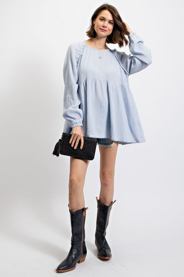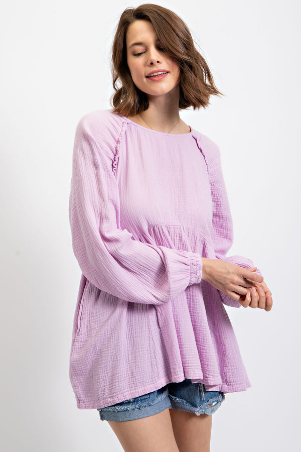 Lift your spirits with our Brighten My Day Babydoll Top! Made of lightweight and breathable cotton gauze, it features a playful boat neckline and mini ruffle details. The relaxed and loose fit adds a flirty touch, while the unfinished seam details give it a unique twist. Available in fun spring colors: Lilac, Lime, and Sky Blue.