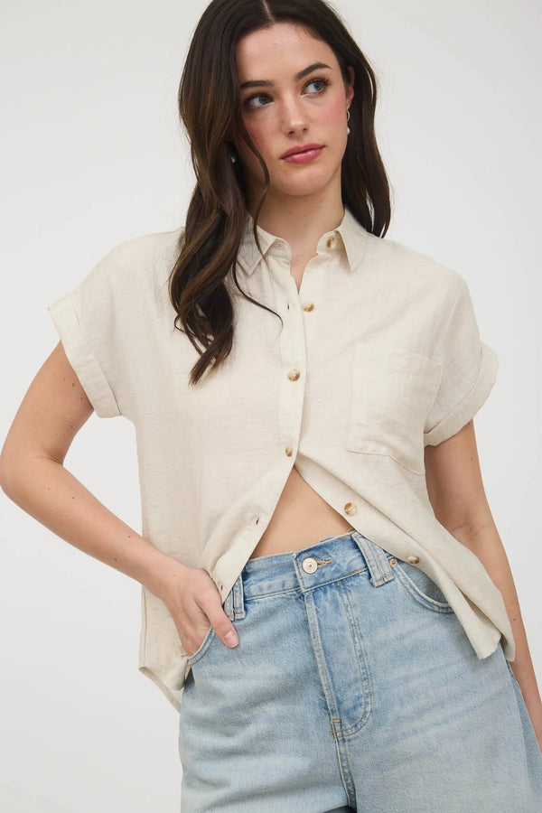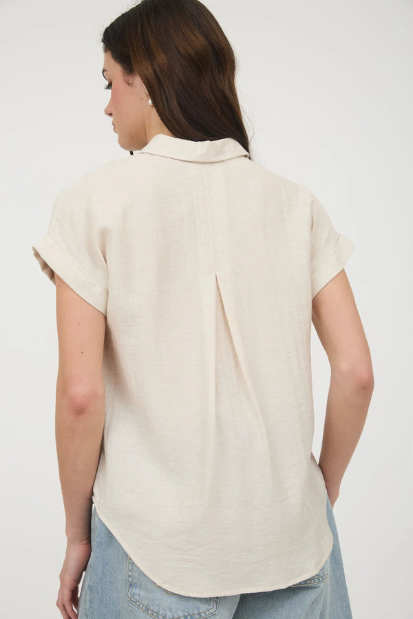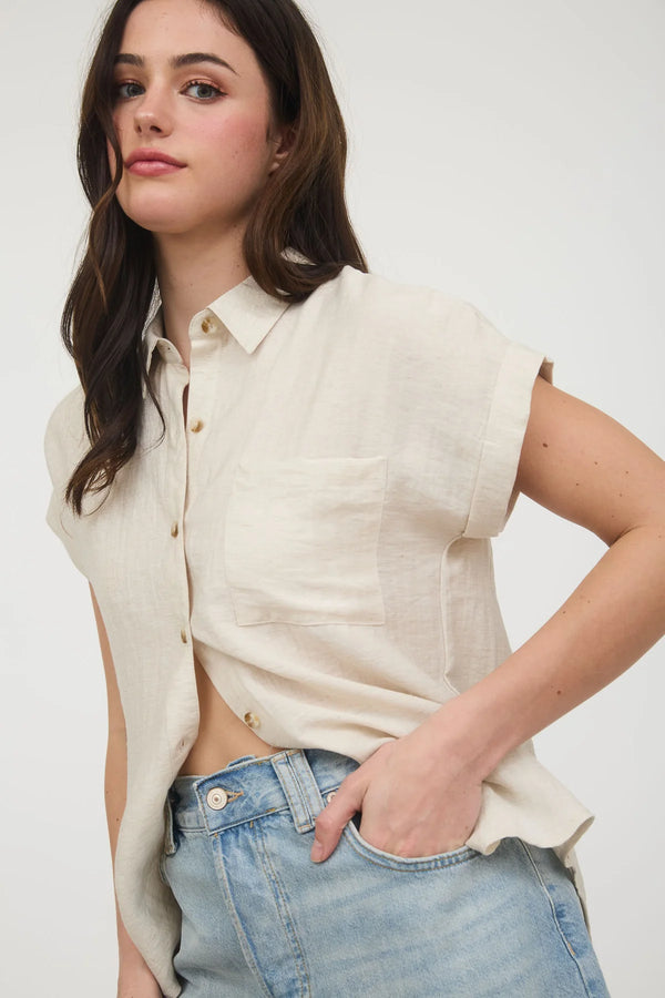 Playfully add some versatility to your wardrobe with our Brynn Button Front Top! This classic, collared shirt features a back pintuck detail and pocket accent, perfect for both dressed up and casual occasions. The lightweight, oatmeal linen blend is a versatile neutral, allowing you to wear it open over a bandeau top or cami, or button it up for a classic look. A staple piece you'll love!