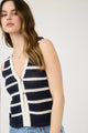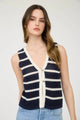 Elevate your wardrobe with our By The Sea Button Front Vest. Featuring a sophisticated navy and white stripe pattern, V-neckline, and functional front buttons. The split hem and contrast trim detail add a touch of casual chic to this effortlessly cool, nautical-inspired piece.