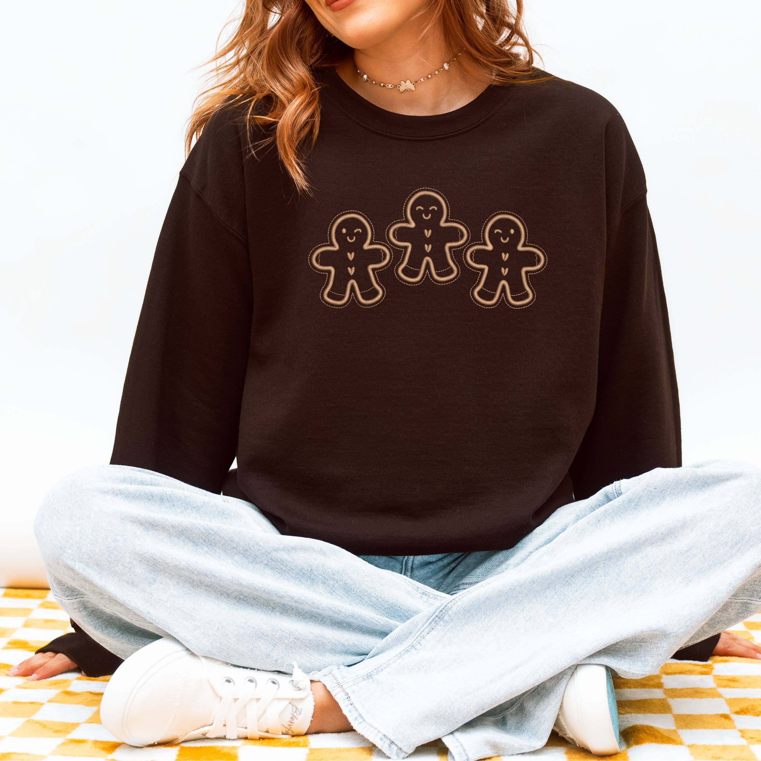 Cozy up in our Gingerbread Trio Embroidered Sweatshirt, a dark chocolate brown essential that brings festive charm to your seasonal wardrobe. Three adorable gingerbread men dance across the front, spreading holiday cheer with every wear. Crafted from a soft cotton-polyester blend with a brushed interior, this sweatshirt delivers serious comfort without sacrificing style. The relaxed fit is perfect for lazy days by the fire, while ribbed cuffs and hem seal in warmth. Whether you're hosting holiday gatherings or enjoying quiet winter moments, this playful piece is your new favorite go-to for feeling merry and snug.