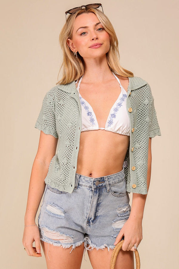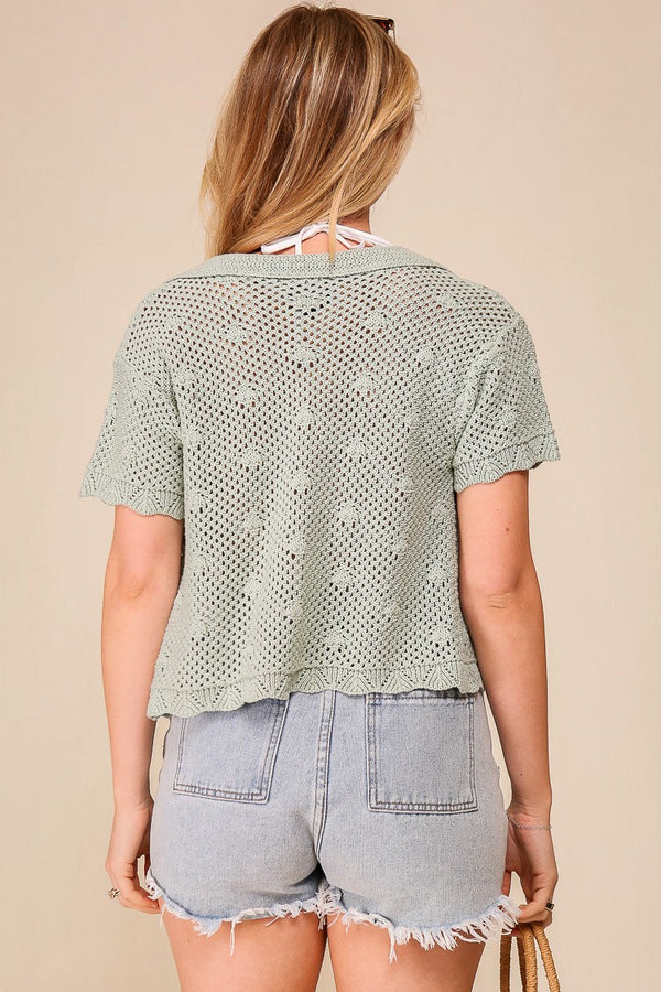Add a playful twist to your wardrobe with the Cousins Crochet Button Front Top! Featuring delicate pointelle detailing and a charming button-down front, this lightweight sweater combines vintage vibes with modern comfort. Its classic collar and short sleeves make it the perfect piece to layer or wear solo. Whether paired with high-waisted pants or a flirty skirt, it’s your go-to for effortlessly chic, retro-inspired style that shines from day to night.