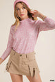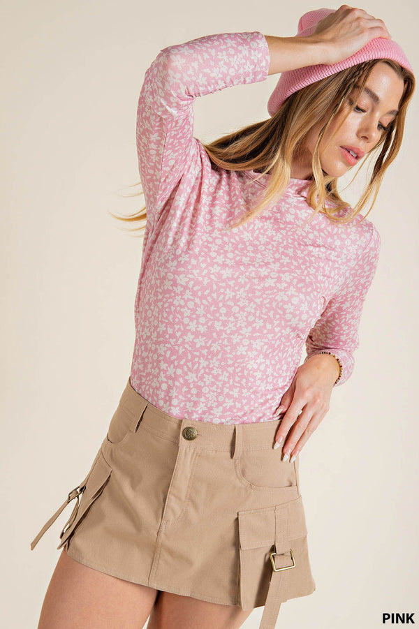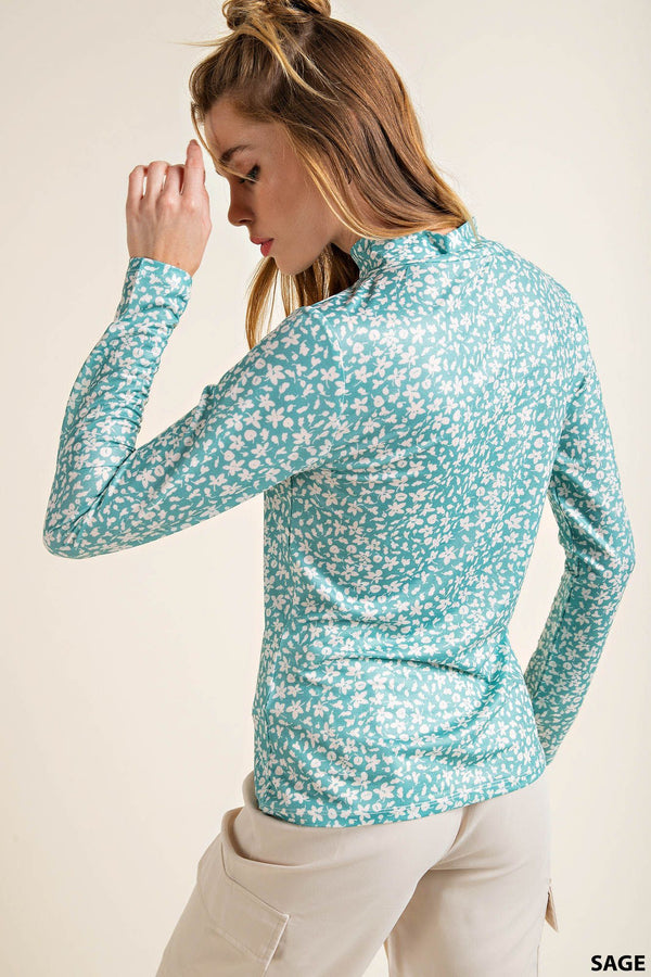 This soft crepe knit top features a darling ditsy floral print, mock neck, and long sleeves. Perfect for transitioning into cooler days, this lightweight top can be dressed up or worn casually. Absolutely adorable under tank dress. Available in mauve or sage.