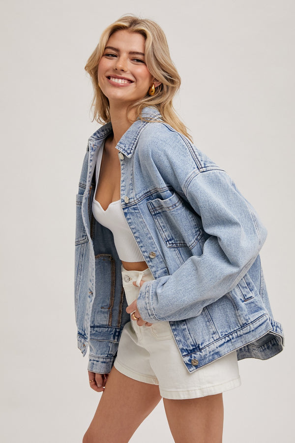 Elevate your casual looks with the Devin Oversized Denim Jacket. Made from durable denim, this versatile piece offers both style and functionality. Featuring an oversized silhouette and spacious pockets, it's perfect for layering over any outfit. Whether paired with leggings or a dress, this jacket is a must-have for any season.