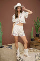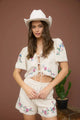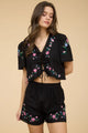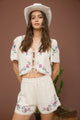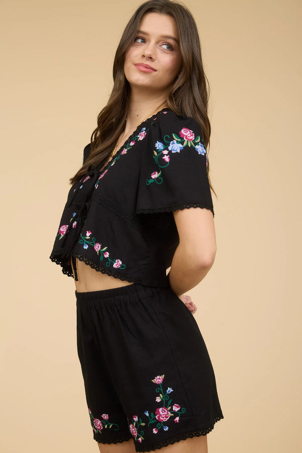 Embrace festival vibes with our playful tie-front top in Black or Natural. Adorned with vibrant floral embroidery along the hemline, shoulders, and V-neckline, this cropped linen blend blouse features charming crochet scallop trim. Wear it tied or open for versatile styling options. Perfect paired with matching shorts for the ultimate festival-ready look that's sure to turn heads!