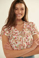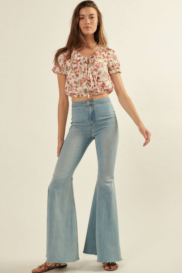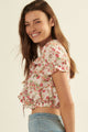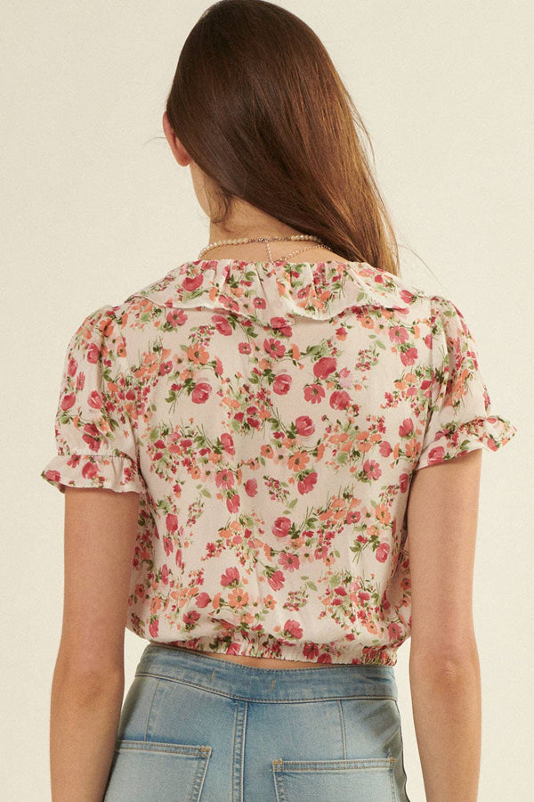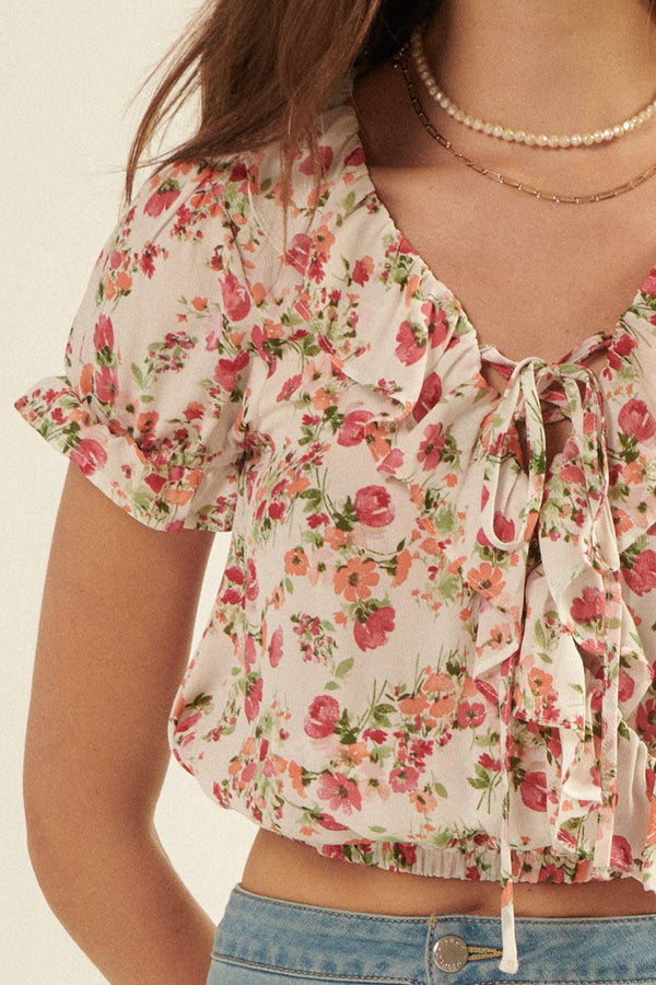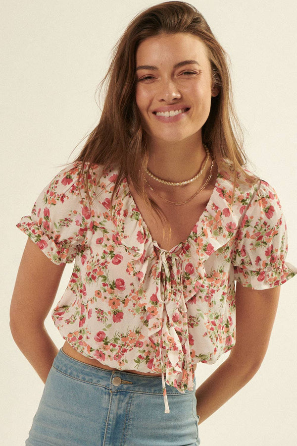 The Flirty Floral Crop Top is a playful addition to your wardrobe with its coral and cream floral print on soft chiffon. It features a surplice neckline with ruffles, a charming ruffle collar, and short puff sleeves finished with elastic ruffle cuffs. The elastic waist and self-tie front closure create a fitted silhouette that’s both sweet and trendy. Pair it with your favorite denim or skirt for a fun, feminine look that’s perfect for any occasion.