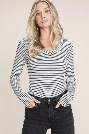 Elevate your basics with the Gimme Stripes Bodysuit—a playful twist on a classic! Featuring a V-neck and long sleeves, this lightweight black and white striped knit fits like a dream without bunching or coming untucked. Perfect for layering, it pairs effortlessly with denim, trousers, or skirts, making your outfit choices fun and fuss-free. Snap button closure adds convenience to this must-have wardrobe essential.