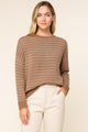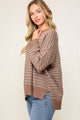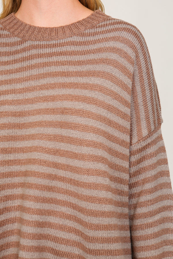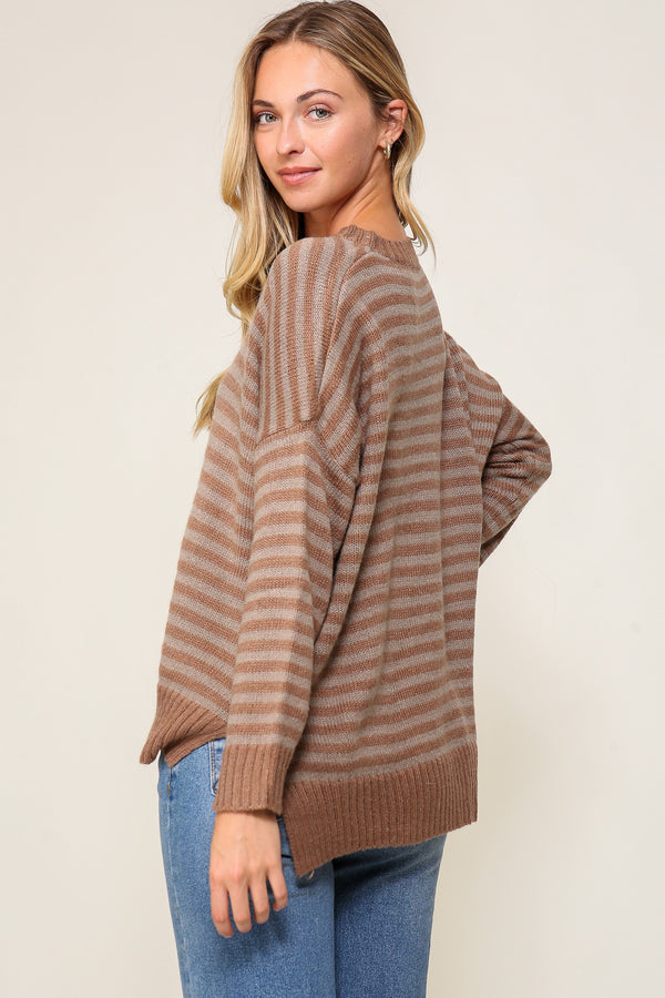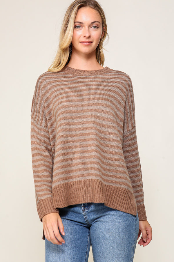 Stay cozy and stylish in this playful Homecoming Sweater. Featuring trendy brown and grey stripes with a loose, relaxed fit, it’s perfect for layering or wearing solo. The soft fabric and classic round neckline keep you comfortable and chic through cooler days. Pair it with your favorite jeans or leggings for an effortlessly fun look, whether you're out and about or relaxing at home.