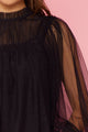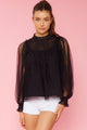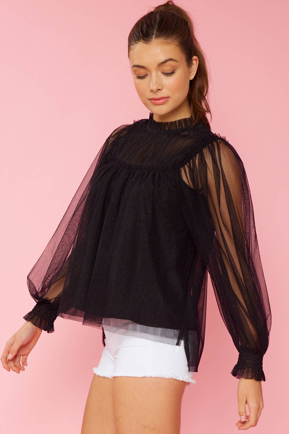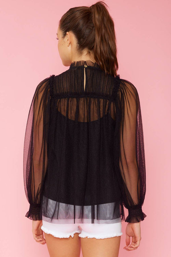 Elevate your evening look with this show-stopping tulle blouse featuring a ruffled neckline and subtle sparkle that catches the light just right. The sheer black overlay creates an airy, romantic vibe, while the built-in satin camisole keeps you covered in style. A chic keyhole back with button closure adds that perfect touch of drama. Dress it up with our Reba Wide Leg Pants for sophisticated elegance, or pair it with the Shine Bright Slip Skirt for a dazzling night out. Pure magic in every wear.