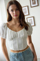 Elevate your wardrobe with our Love Story Top. This pure white crop top features a romantic back tie, corset waist, and ruched bust for a feminine silhouette. Short puff sleeves and ribbing waist detail add a whimsical touch to this sophisticated piece. Perfect for elevating any occasion.