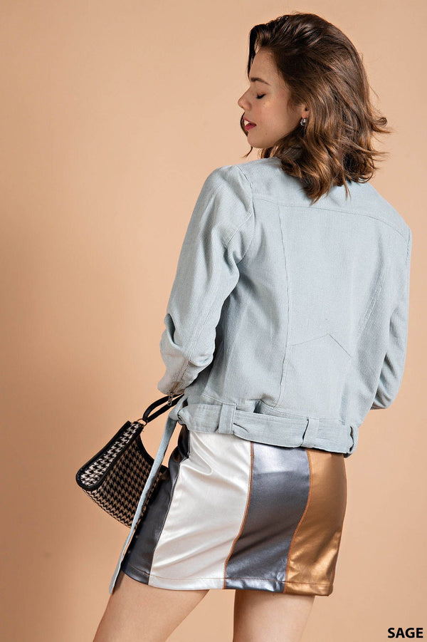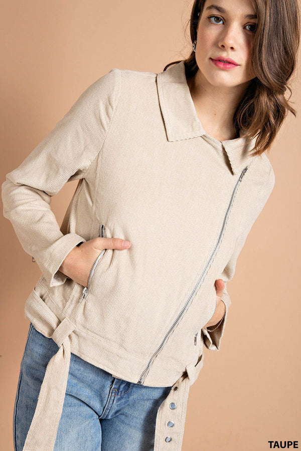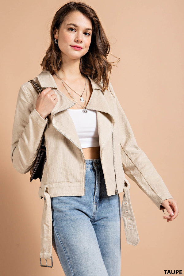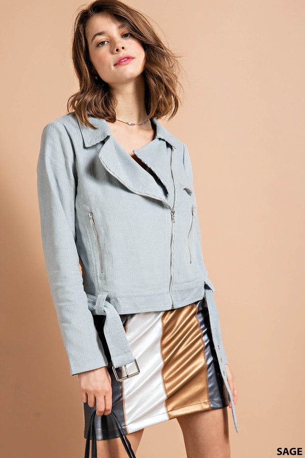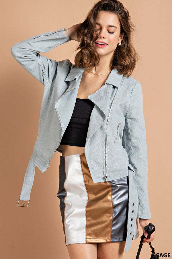 Level up your style game with the Make A Move Moto Jacket! Perfect for transitional weather, this corduroy jacket features metal hardware like snaps, buckles, and zippers for a touch of sophistication. Choose from Blue Sage or Taupe to elevate any look.