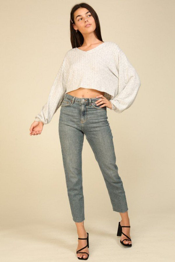 Stay cozy and cute in the Making Memories Cropped Sweater! This soft, lightweight knit top features a flattering V-neck and comfy long sleeves. Its ribbed texture and light grey hue make it a fun layering piece or a stand-alone favorite for breezy days. Perfect for those playful fall vibes!