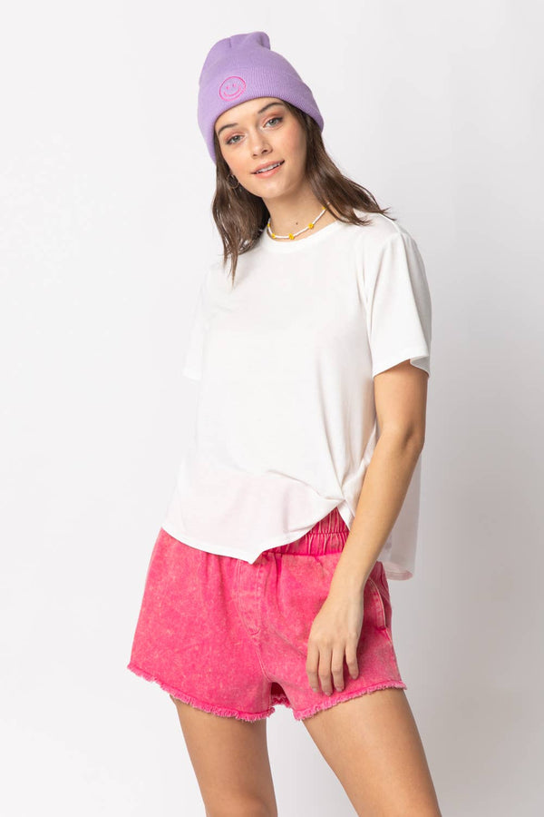 The Twisty Tee is your new go-to for effortless style with a fun twist. Made from soft heathered jersey knit, this lightweight short sleeve top features a playful twisted hem that adds a flirty flair to a classic crewneck. Perfect for keeping cool and looking cute all day long!