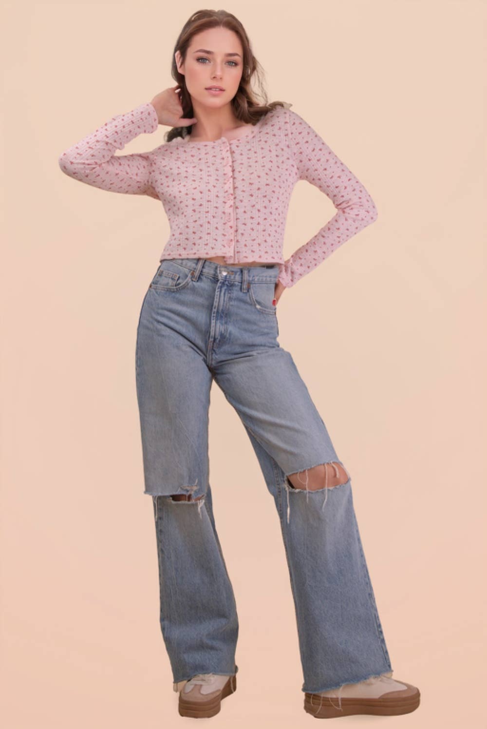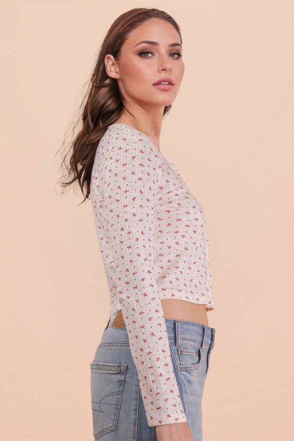 Your Valentine's Day wardrobe just got an upgrade. This lightweight knit cardigan comes in three irresistible prints—blush bow, cream bow, or cream floral—each one sweeter than the last. Button it up as a standalone top with denim for effortless cool, or layer it over a cami and skirt for that romantic, feminine vibe. The cropped silhouette and round neckline keep things fresh and fun, making this the versatile piece you'll reach for long after February fades away.