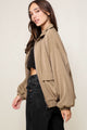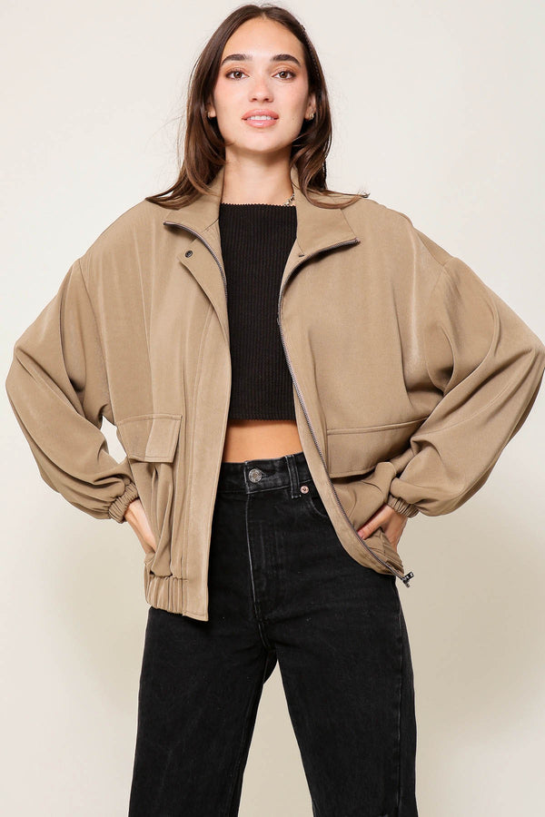 Meet your new go-to jacket, the Quinn Bomber. Lightweight and oversized with an elastic waistband and zip closure, it effortlessly combines style and comfort. With front pouch pockets and a cool neutral dark khaki color, it's the perfect addition to any outfit. Time to up your jacket game.