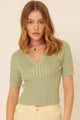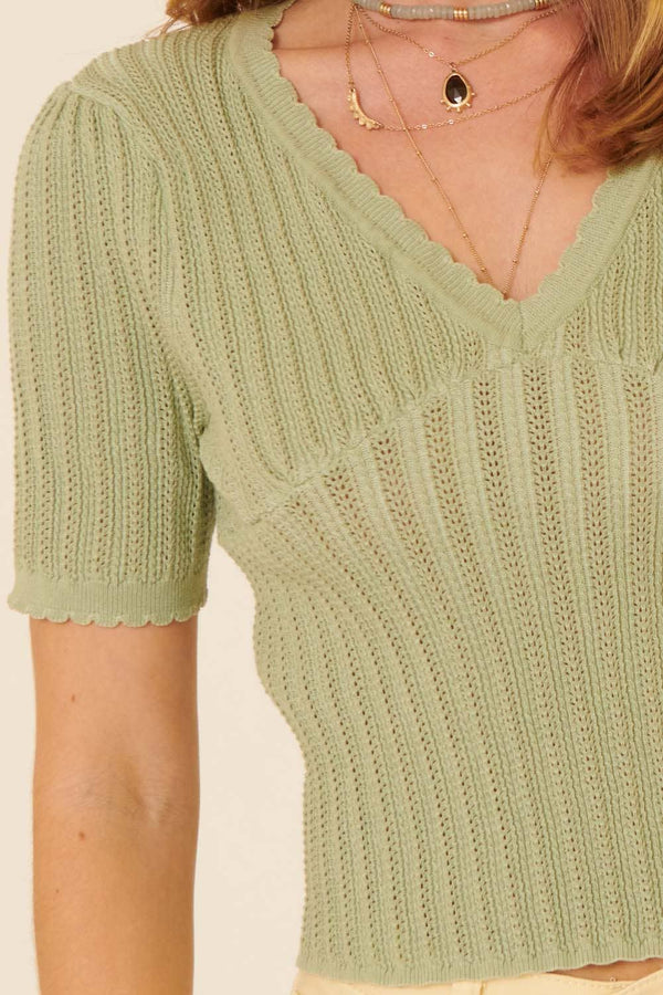 This playful thyme green sweater top features a V neckline and cap sleeves for a fresh, breezy look. The braided knit and scalloped lettuce hem add charming details, while the relaxed fit keeps it comfortable. Perfectly crafted with care, the On Thyme Sweater Top pairs effortlessly with denim for casual days or with a skirt and block heels to elevate your special occasion style.
