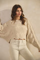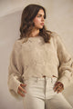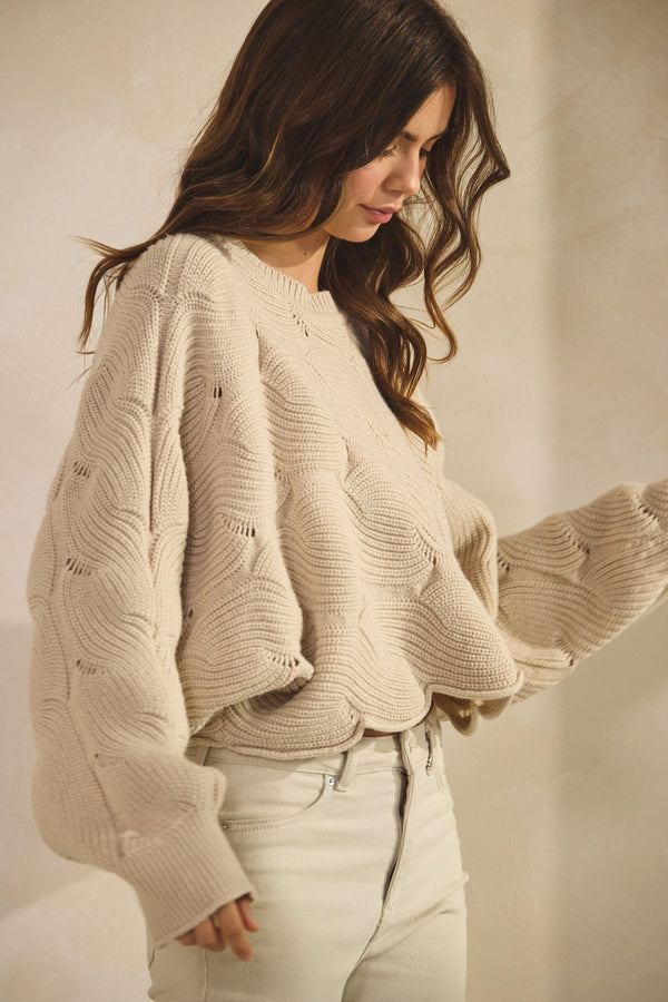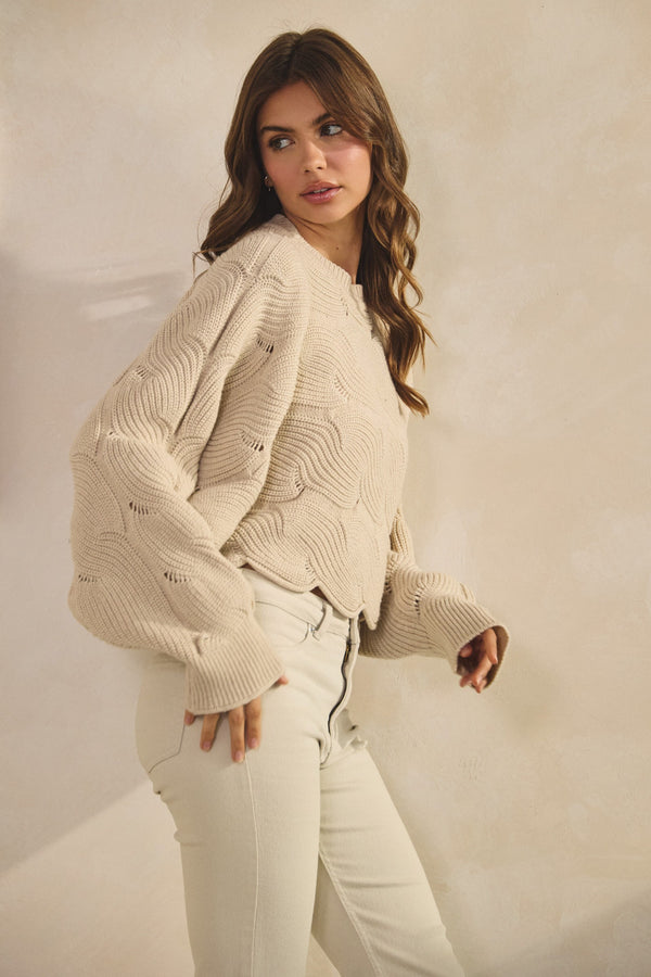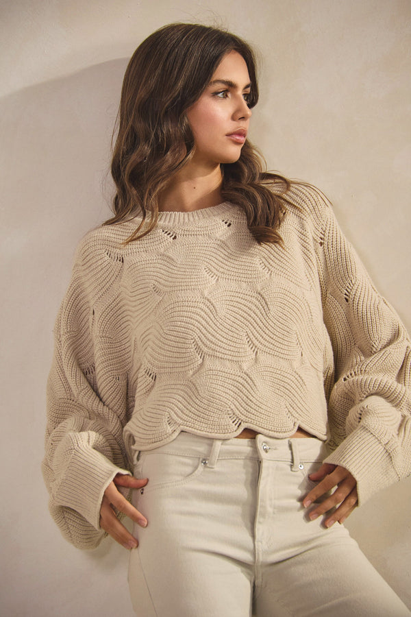 The Sandy Swirl Sweater is your new cozy essential. Featuring a relaxed fit and playful scalloped pattern, this rib knit pullover in a soft neutral sand shade adds charm to any outfit. Its unfinished hem and cropped length make it easy to layer—dress it up with a skirt or slip it over a dress for a flirty twist. For chill days, pair it with your favorite denim or leggings and let comfort meet cuteness effortlessly.