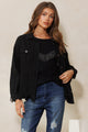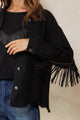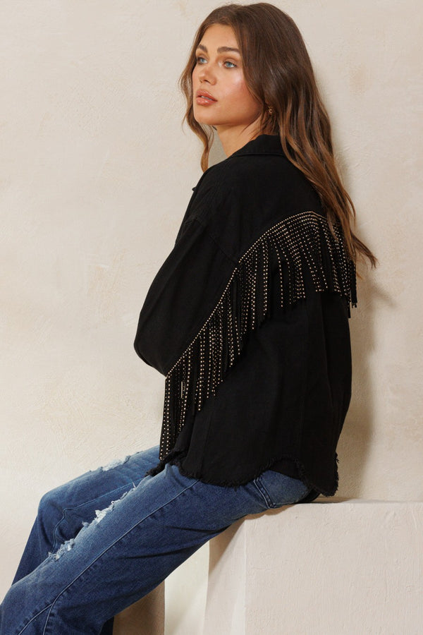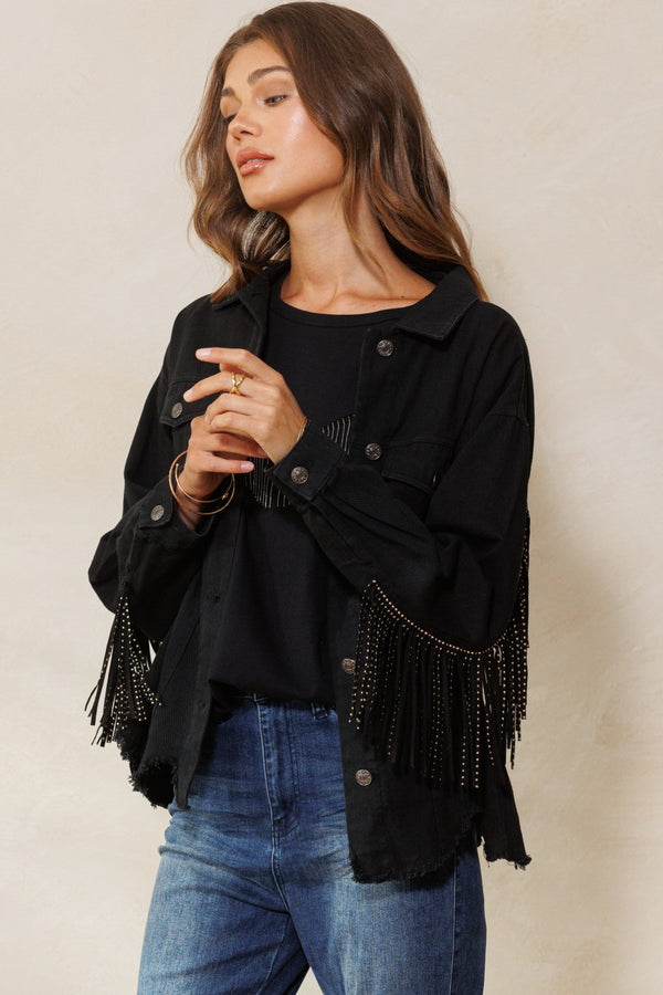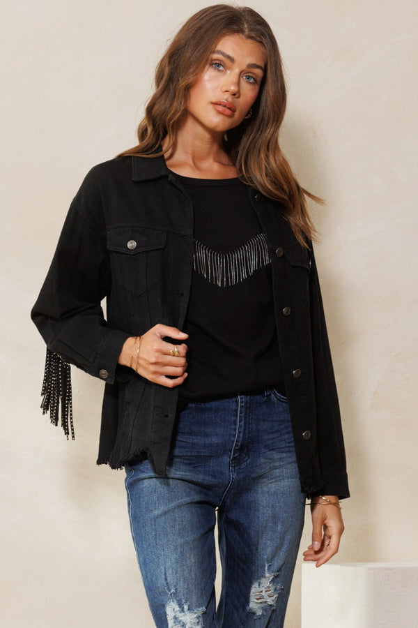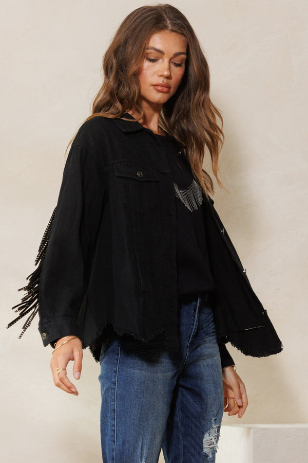 Add some bold vibes to your look with the Sedona Studded Fringe Jacket! This classic black denim piece gets a fun twist thanks to faux suede fringe and stud detailing that adorn the sleeves and back. Long sleeves and front breast pockets keep it practical, while the raw hem adds just the right amount of worn-in cool. Button it up or leave it open—either way, you’re ready to make a statement with effortless style.