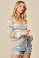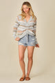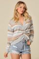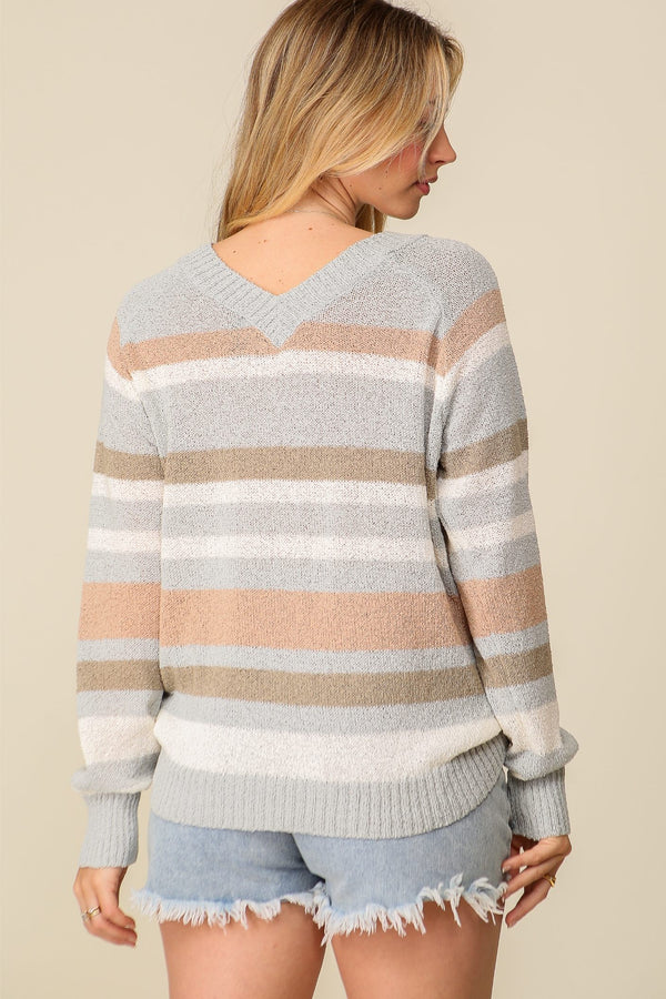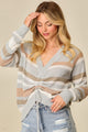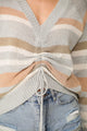 Elevate your spring wardrobe with our versatile and effortlessly stylish Spring Forward Ruched Sweater. The classic v-neckline adds a touch of allure, while the shirring string tie at the waist allows you to customize your silhouette. Adorned with colorful stripes, this top adds a playful and dynamic charm to any outfit.