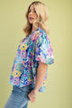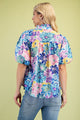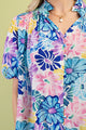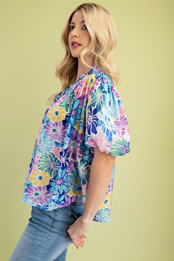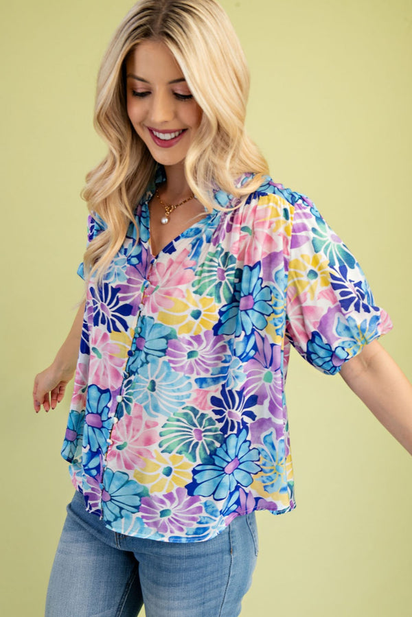 Get ready to blossom in our Spring Vibrance Top! This flirty blouse features a vibrant and bright floral print in shades of blue, purple, pink, and a touch of yellow. With a collared V neckline and puff sleeves, this top is perfect for adding a playful touch to any outfit. Plus, the covered buttons add an extra fun detail.