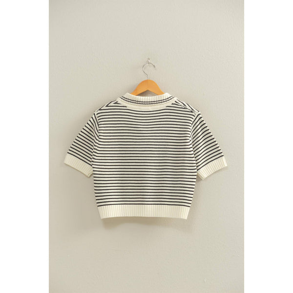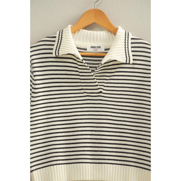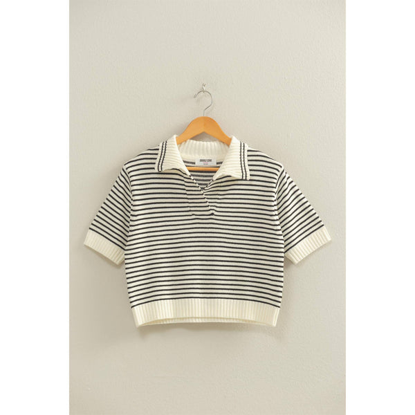 Step out in style with the Shayna Sweater Top! Featuring a fun striped pattern, a crisp collared neckline, and short sleeves with ribbed hems, this top effortlessly blends comfort and charm. Its relaxed fit and ribbed trim along the hemline add just the right touch of shape, making you look put together without trying too hard. Perfect for days when you want to feel cozy and cute all at once!