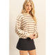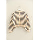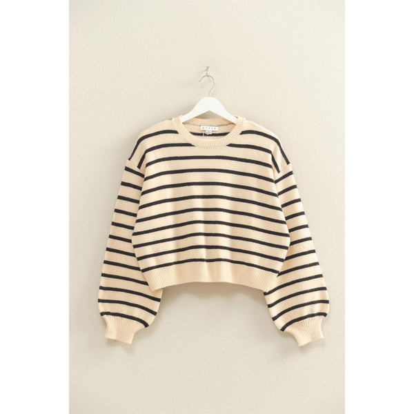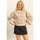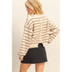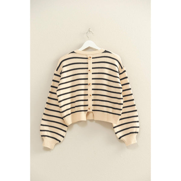 This Sophisticated Charm Sweater in black or camel brings playful elegance to your wardrobe with its classic stripes and chic button-back detail. Its relaxed fit and timeless crewneck make it perfect for layering over a collared shirt or pairing with your favorite jeans, effortlessly shifting between smart and casual looks. Ideal for the in-between seasons, this luxurious sweater adds a touch of refined charm to any outfit.