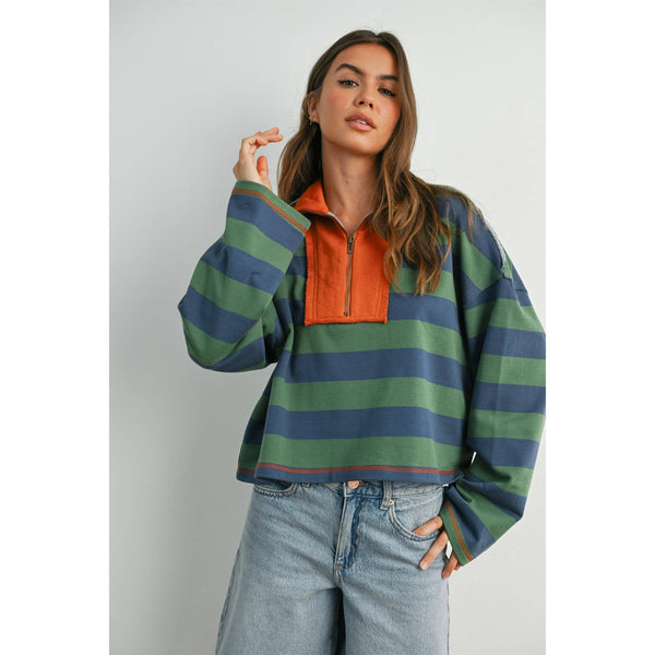 The Selma Striped Quarter-Zip Sweatshirt brings the fun with bold blue and teal stripes that pop against a burnt orange contrast collar. The quarter-zip design gives you easy styling options—zip it up for extra warmth or wear it open for a relaxed vibe. Crafted from soft, cozy fabric that feels as good as it looks, this cropped sweatshirt is your ticket to effortlessly chic comfort. Throw it over a tee, pair it with your favorite jeans, or rock it solo. Pure casual cool.