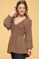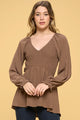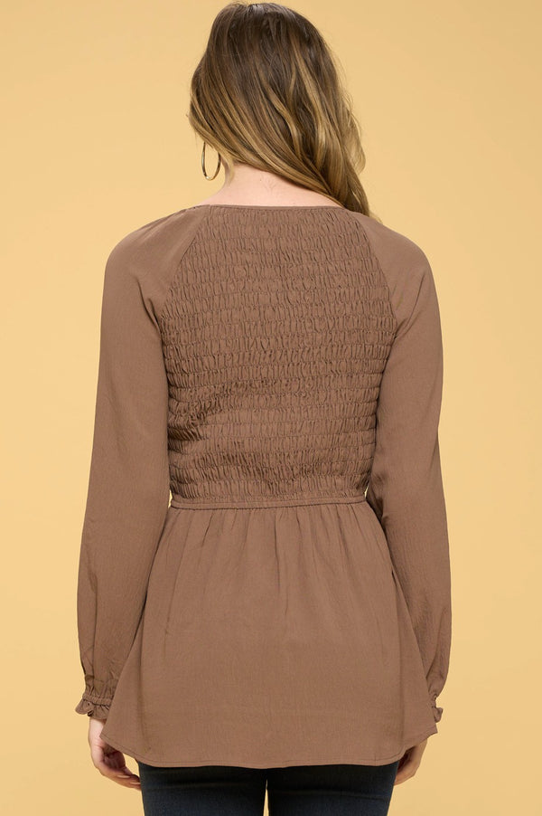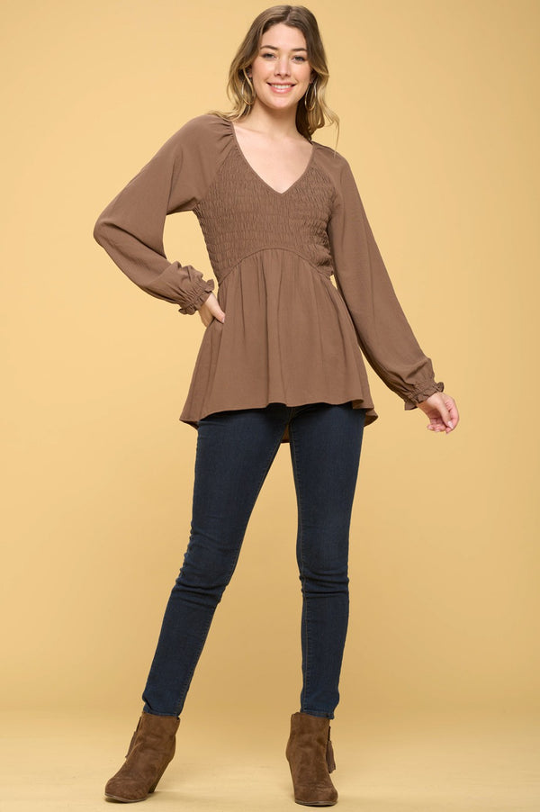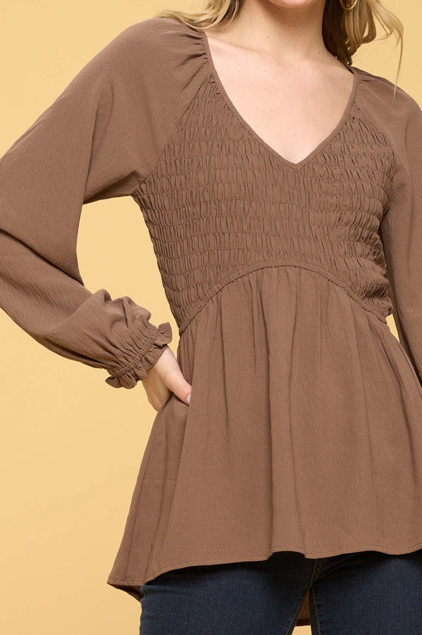 Embrace effortless charm with the Toffee Smocked Blouse. This lightweight woven top features a flattering v neckline and playful long sleeves finished with elastic cuffs and ruffle detailing. The smocked upper bodice adds texture while the peplum high-low hemline creates a flirty silhouette. In a warm toffee brown, it’s perfect for adding a sweet touch to any outfit.