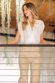 This white Under Wraps Bodysuit features a crossover/wrap front and snap closure neckline for a tucked blousy look. With a deep v neckline, elevate any outfit with this versatile and sophisticated piece. Wear it with jeans, trousers, or a skirt for a chic and polished ensemble.
