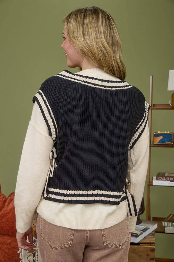Add a playful twist to your wardrobe with this Varsity Tie Sweater Vest. A sleeveless V-neck and relaxed drop shoulders, its cozy cable knit design is elevated by side bow ties and contrasting line trim. Cropped and charming, this vest effortlessly brings personality and a touch of fun to any outfit.