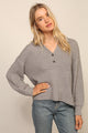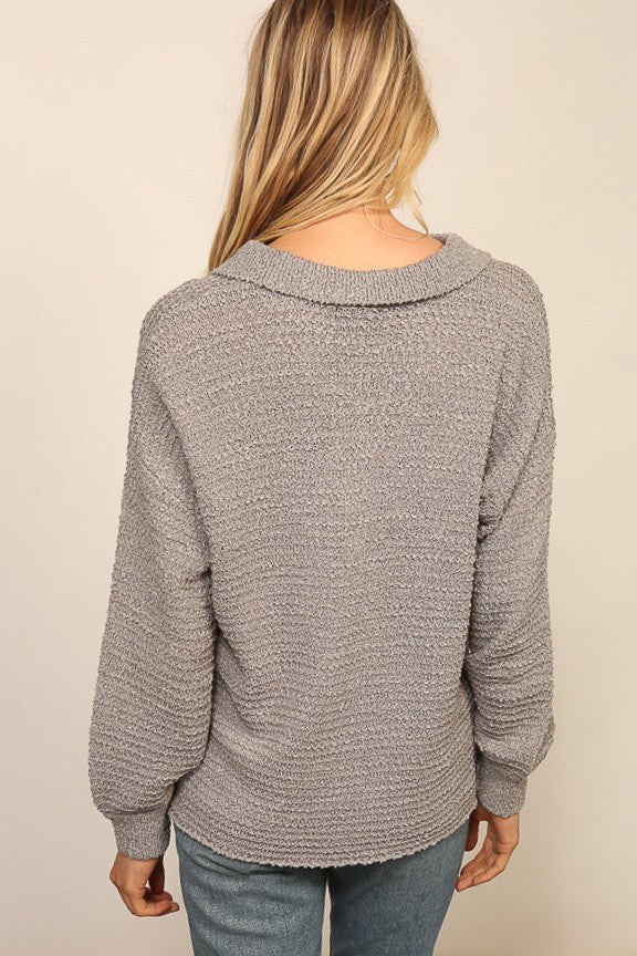 Elevate your style with the Veda Textured Sweater, a cozy yet chic long-sleeve top designed to stand out. Its playful V-neck and button details add a fresh twist, while the textured knit wraps you in comfy warmth. The cute collar brings just the right amount of preppy charm. Pair it with your favorite jeans for a casual yet refined look, or style it with tailored pants for a more elevated ensemble. Ready to mix comfort and sophistication with the Veda Sweater?