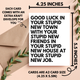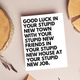 "Good Luck in Your Stupid New Town" card, a perfect snarky and humorous option for anyone seeking a unique and playful way to bid farewell to friends moving away. This card is a standout if you are looking for something distinctively witty and memorable. - Front: Good luck in your stupid new town with your stupid new friends in your stupid new house at your stupid new job. - Inside: blank - A2 card size (4.25in x 5.5in) - 100 lb Lynx cover uncoated cardstock - Includes extra kraft envelope - Card + envelope wrapped in an cello sleeve
