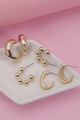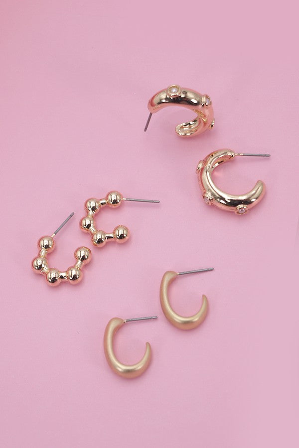The trio of earrings are a huggie style design, small and close-fitting to the earlobe. The earrings feature three earrings, with matte-finished spherical elements, small pearls are incorporated into the design, adding a touch of classic and elegant aesthetics.